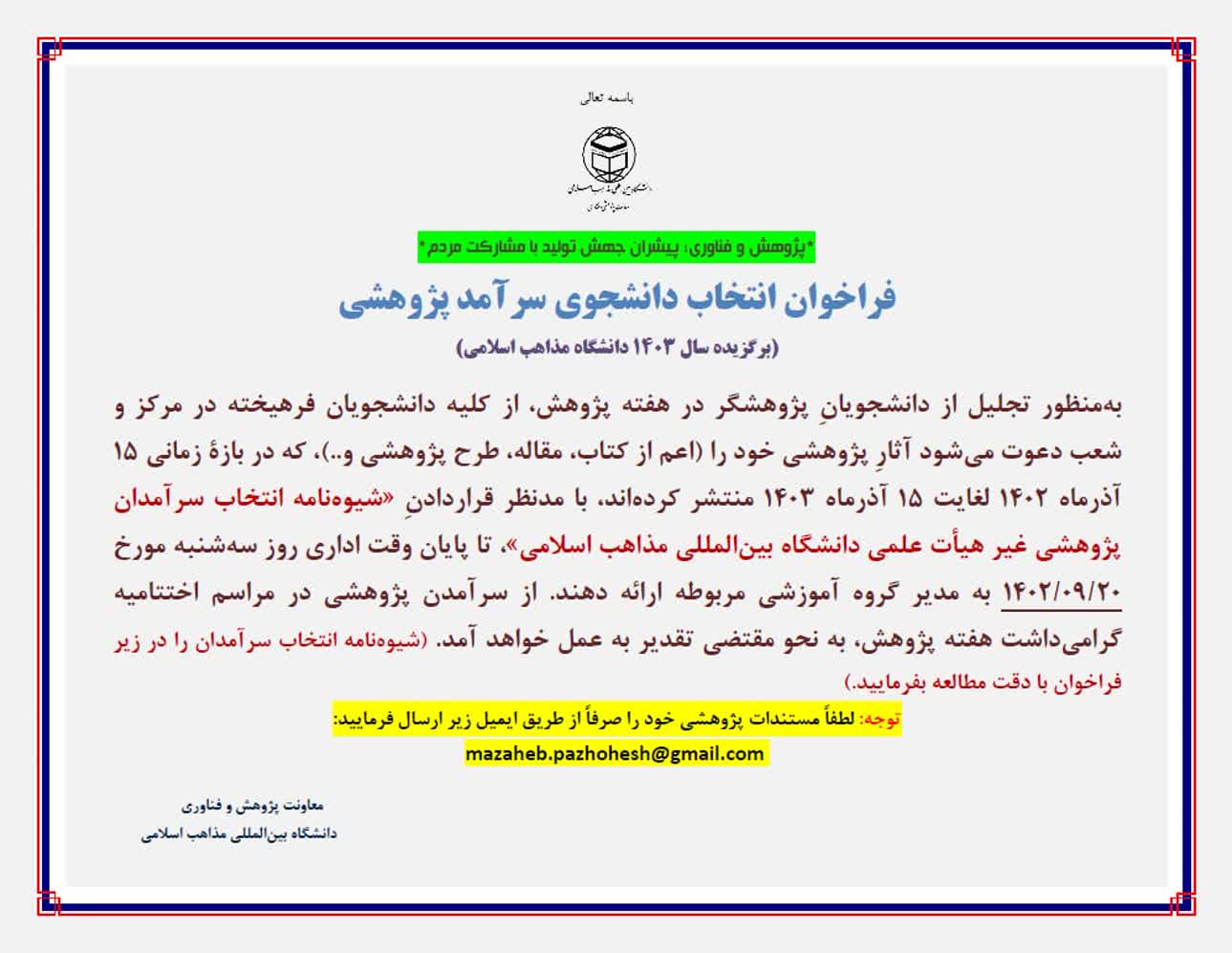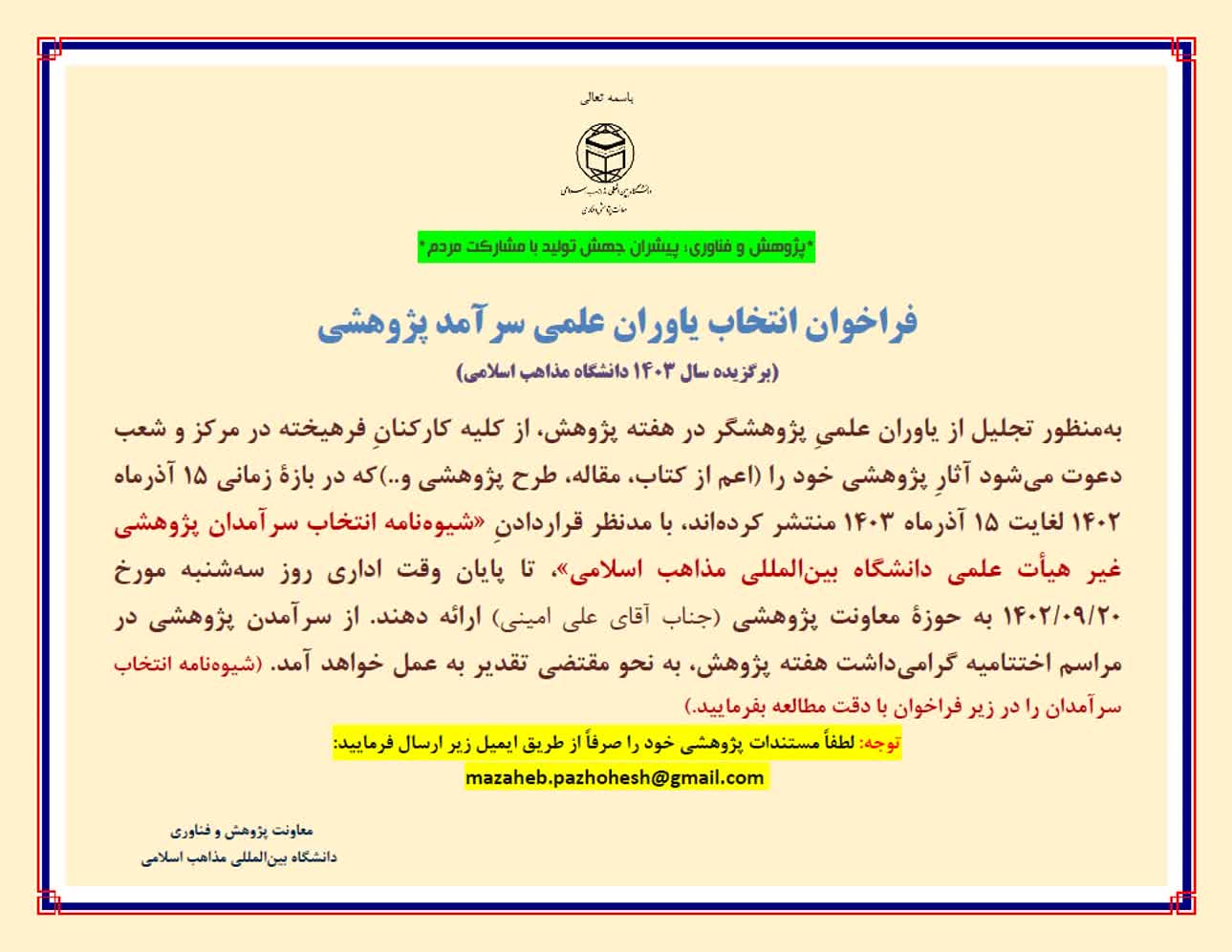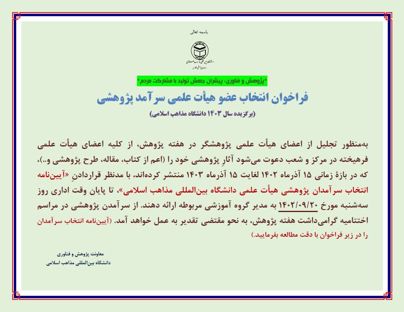 فراخوان انتخاب عضو هیأت علمی، دانشجو و سرآمدان پژوهشی غیر هیأت علمی دانشگاه بین‌المللی مذاهب اسلامی در سال ۱۴۰۳