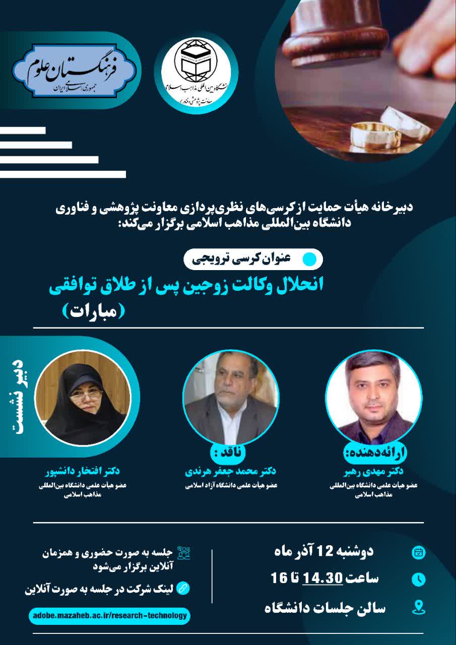 برگزاری کرسی علمی- ترویجی: انحلال وکالت زوجین پس از طلاق توافقی(مبارات)