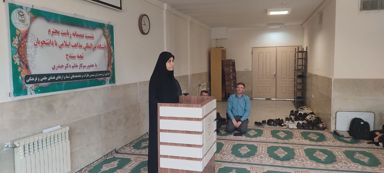 خانم دکتر حیدری معاون پشتیبانی و توسعه منابع دانشگاه مذاهب اسلامی نیز در این نشست بر تقویت خدمات رفاهی و خوابگاهی به دانشجویان این دانشگاه تأکید کرد و گفت: رئیس شعبه سنندج باید با نظارت دقیق بر کیفیت تغذیه و امکانات خوابگاهی جوابگوی دغدغه دانشجویان باشد و ما آمادگی داریم اعتبارات لازم برای امکانات ورزشی و فرهنگی دانشجویان را تأمین کنیم.