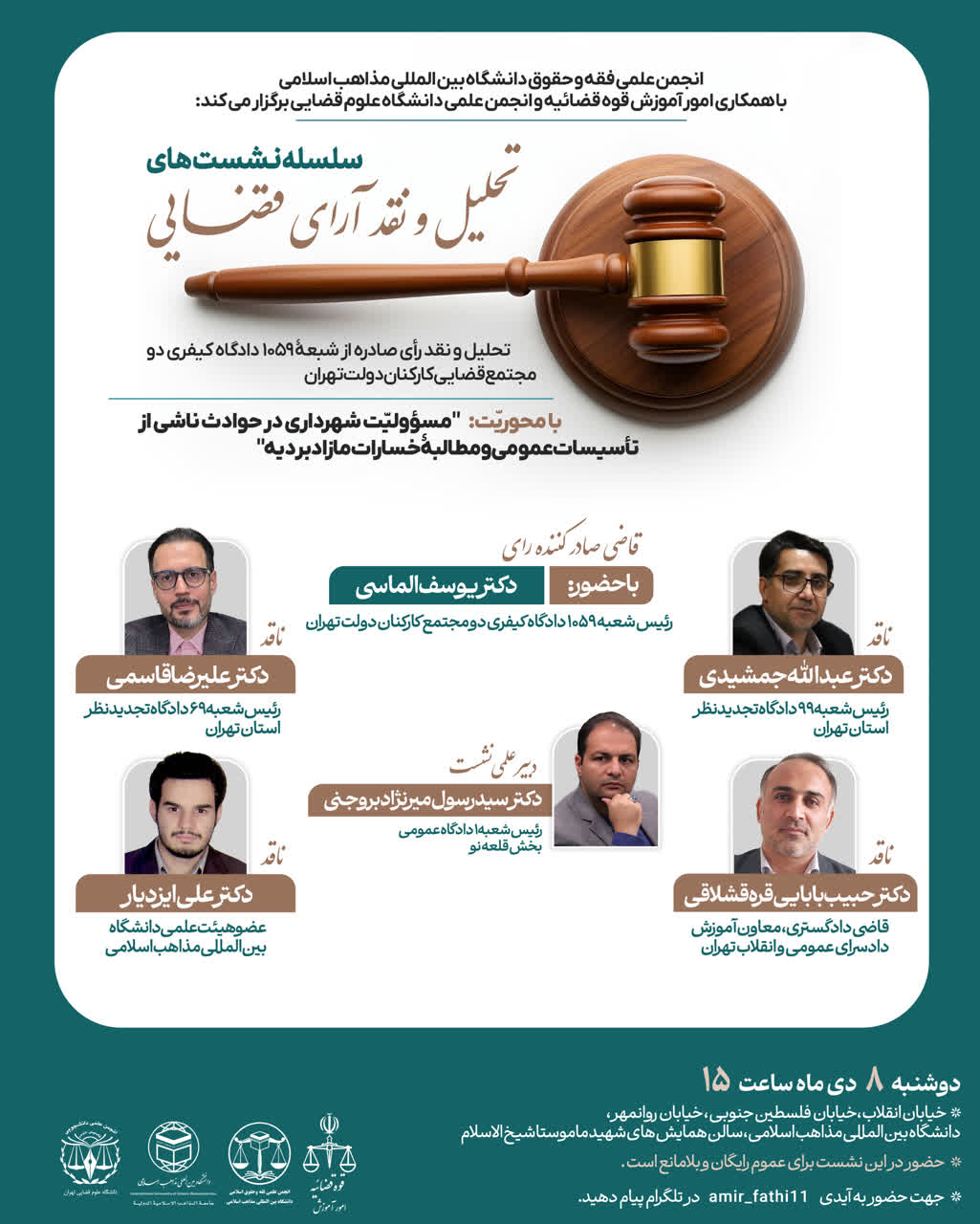 محور اصلی این نشست، واکاوی مبانی حقوقی و فقهی مسئولیت شهرداری در حوادث مرتبط با تأسیسات عمومی و همچنین بررسی چگونگی مطالبه خسارات افزون بر دیه قانونی است که از موضوعات چالشی و کاربردی در نظام حقوقی کشور محسوب می‌شود.